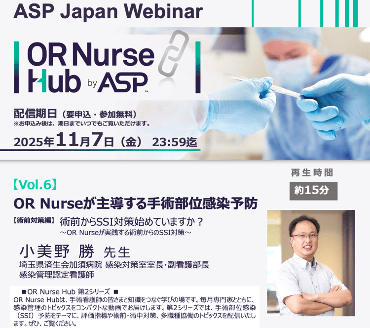 - 【OR Nurse Hub】vol.6「OR Nurseが主導する手術部位感染予防【術前対策編】 術前からSSI対策始めていますか? ~OR Nurseが実践する術前からのSSI対策~」